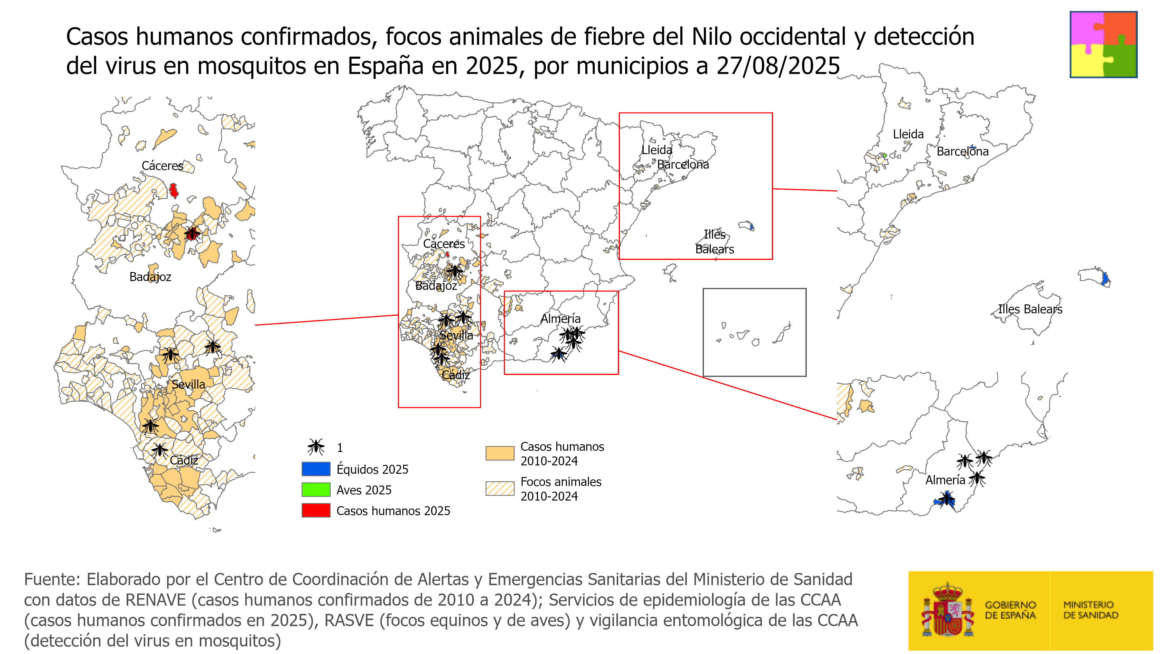 En total, se han registrado siete casos de fiebre del Nilo Occidental en Extremadura en el año 2025, los únicos declarados en España. En España durante 2024, se confirmaron 158 casos de Fiebre del Nilo Occidental (FNO) en humanos, incluyendo 142 casos confirmados y 16 probables, la mayoría en Andalucía (118 casos), seguida de Extremadura (39) y Castilla-La Mancha (1).