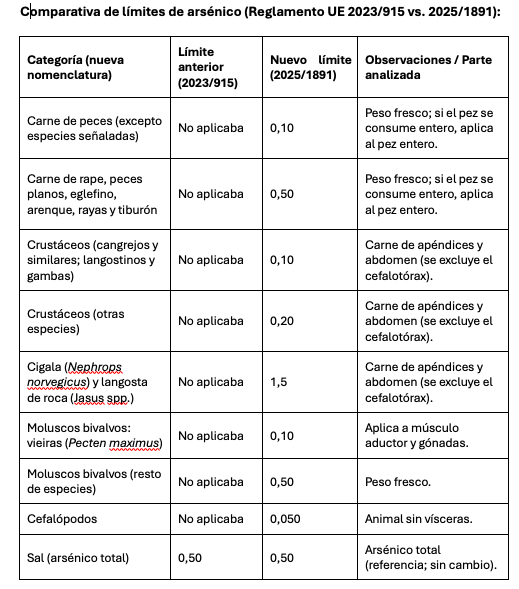 Ahora, la Comisión Europea ha publicado el REGLAMENTO (UE) 2025/1891 DE LA COMISIÓN de 17 de septiembre de 2025 por el que se modifica el Reglamento (UE) 2023/915 en lo que respecta a los límites máximos de arsénico inorgánico en pescado y otros alimentos marinos. De ese modo, se establecen límites más estrictos de arsénico inorgánico en pescados y otros alimentos marinos.