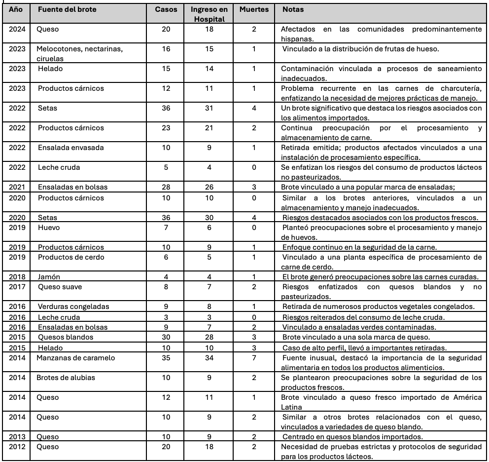 Un reciente brote de Listeria en los Estados Unidos (EE. UU.) en julio de 2024 vinculado a carne en lonchas de charcutería sirve como un ejemplo crítico de los problemas actuales en la seguridad alimentaria. Este brote finalmente originó 61 casos confirmados, 60 hospitalizaciones y 10 fallecidos.