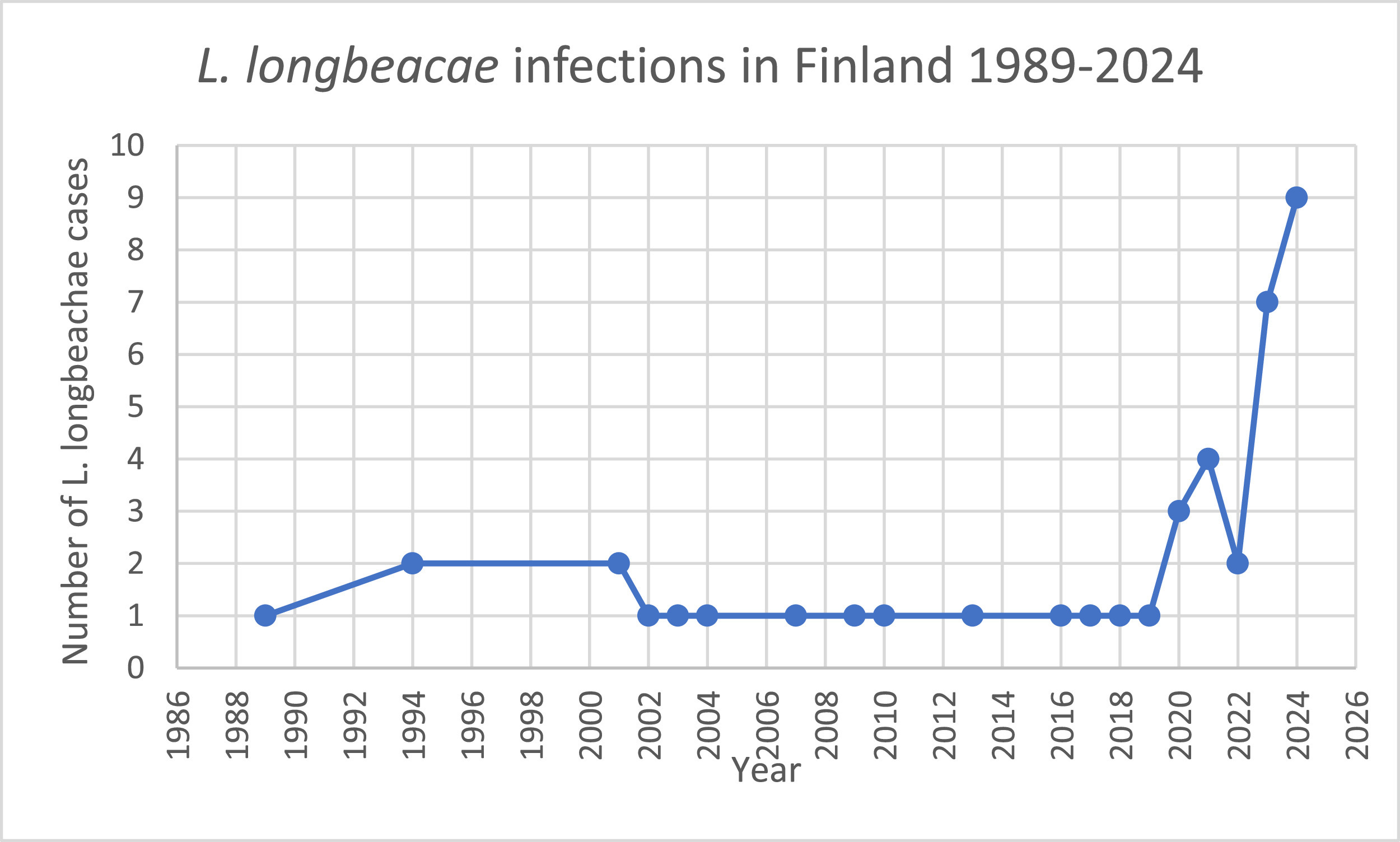 Según un estudio, se informaron 48 infecciones por L. longbeachae en Finlandia durante los años 1989-2024 con 39 notificaciones del National Infectious Disease Register (NIDR) y 25 cepas procedentes de pacientes. Faltaban cinco casos del NIDR, ya que tres de ellos ocurrieron antes del inicio del NIDR, una infección de la articulación de la muñeca en 2017 no se registró y un caso se notificó inadecuadamente como infección por Legionella spp.