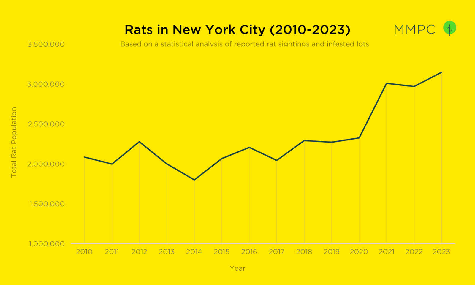 La población de ratas de la ciudad de Nueva York ha sido un tema de interés durante años, especialmente después de la pandemia de COVID-19. Contar todas las ratas es imposible, pero en 2014, un estadístico estimó que había hasta 2 millones viviendo en la Gran Manzana, utilizando los datos del teléfono 311 de avistamientos de ratas de 2010 y 2011.