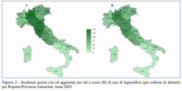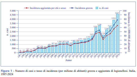 La incidencia de casos de legionelosis en Italia en 2024 fue de 7,85 casos por 100.000 habitantes, con un aumento con respecto al año anterior (6,63/100.000) del 18 %, con una tasa de letalidad del 13,8 %.