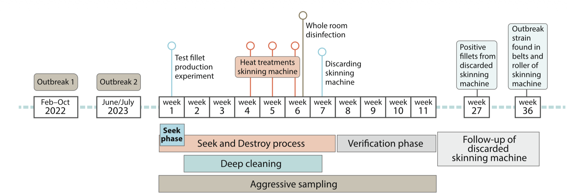 L. monocytogenes puede persistir durante años en equipos que son difíciles de limpiar y en esta instalación un clon persistió en la máquina de despellejado durante al menos ocho meses. También se han publicado situaciones similares con otras máquinas de despellejado en instalaciones de producción de pescado listo para comer.