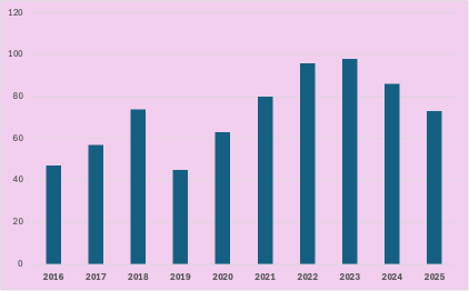 Número de casos de enfermedad del legionario en Aragón. Años 2016 - 2025