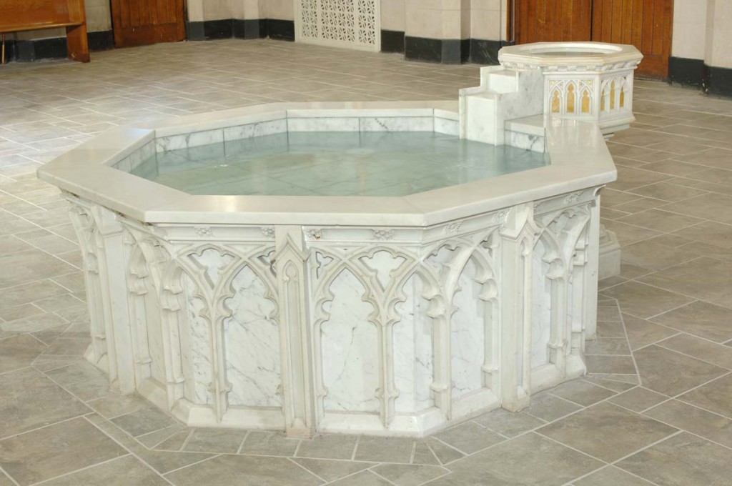 En los primeros siglos, el sacramento del bautismo, por el que el individuo entraba a formar parte de la comunidad cristiana, se administraba sumergiendo al candidato en una pequeña piscina. La mayoría de los teólogos y liturgistas afirman que hubo inmersión total desde tiempos evangélicos hasta alrededor del siglo XIV.