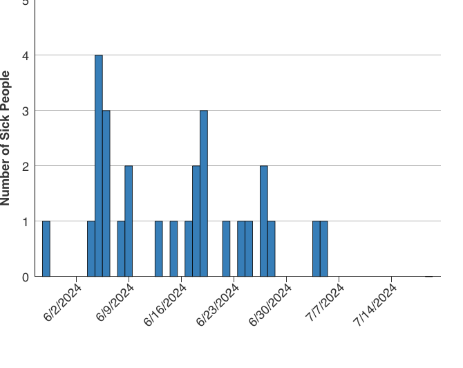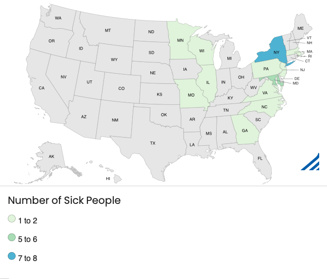 Los estados más afectados son Nueva York, que notificó doce casos, y Maryland, con seis. Georgia, Massachusetts, Missouri, Nueva Jersey y Virginia notificaron dos casos cada uno, mientras que Illinois, Minnesota, Carolina del Norte, Indiana, Pensilvania y Wisconsin notificaron un caso cada uno.