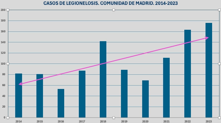 En 2023, en la Comunidad de Madrid se registraron 176 casos de legionelosis, lo que presenta un aumento del 7,9 % con respecto al 2022.