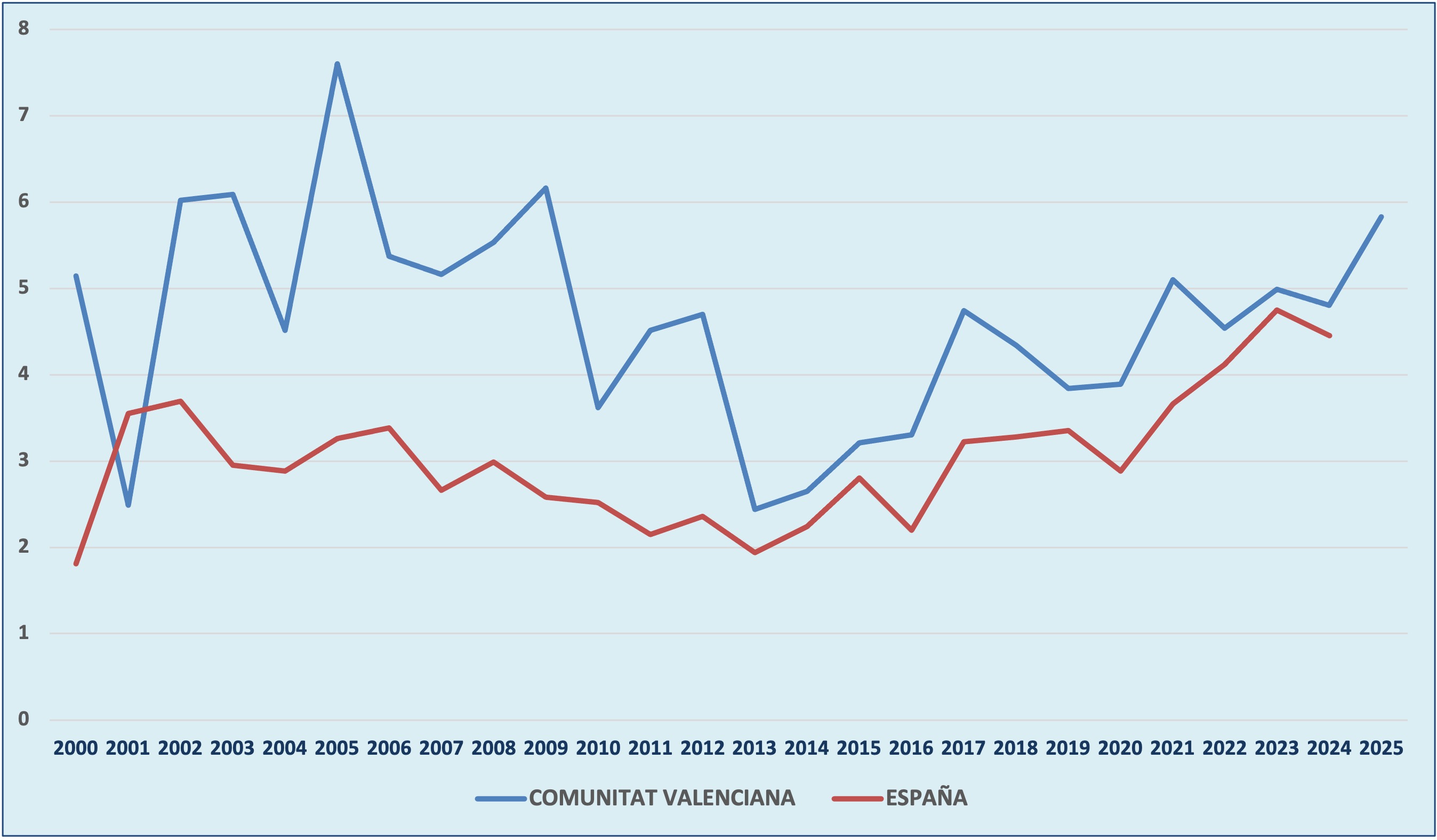Comparativamente, en las cifras referidas a las últimas dos décadas, la incidencia en la Comunidad Valenciana siempre es superior a la de toda España o la Unión Europea.