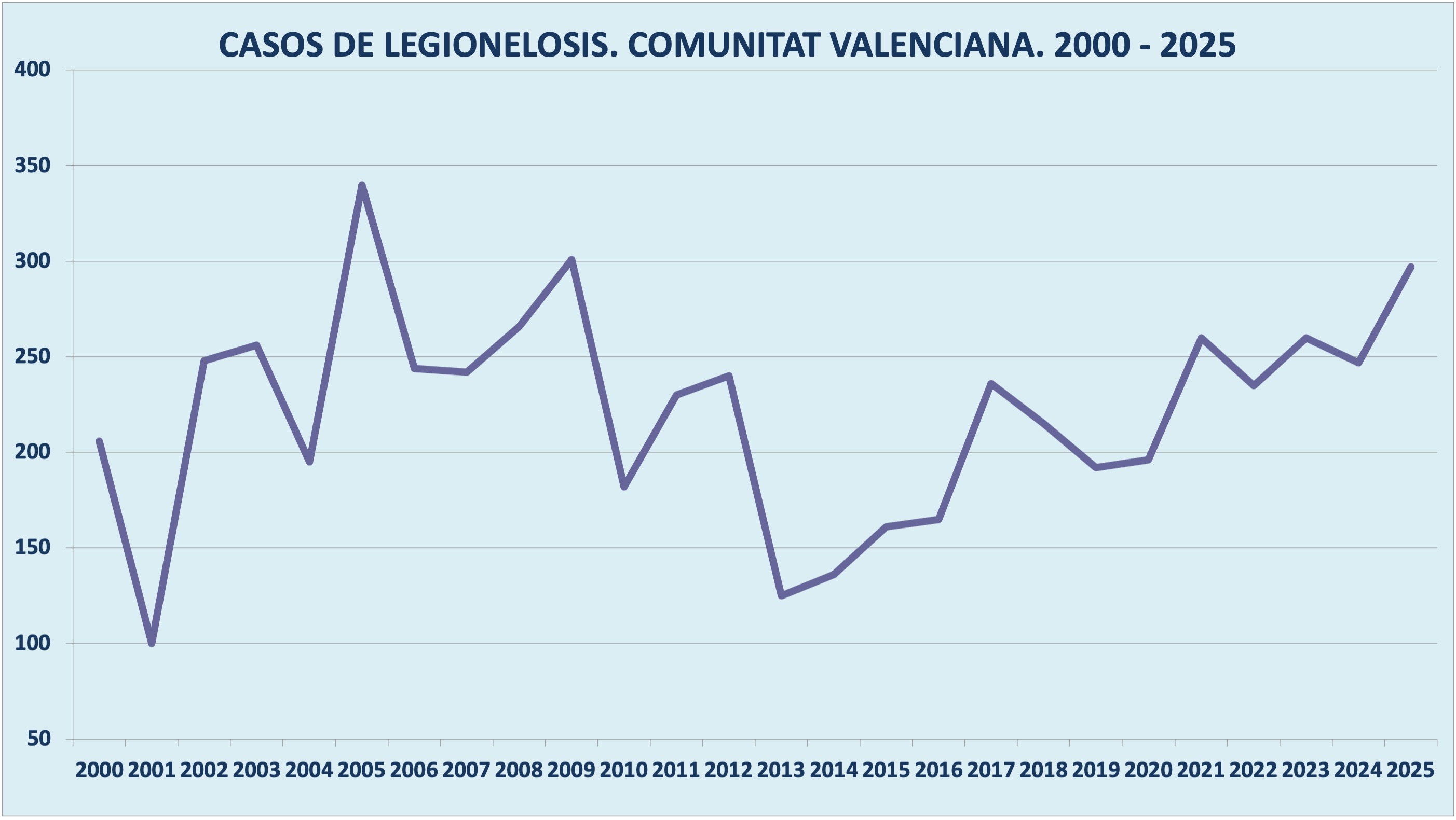 Durante el año 2025, se han declarado un total de 297 casos de legionelosis en la Comunidad Valenciana, lo que comporta una incidencia aproximada de 5,83 casos por 100.000 habitantes. Estas cifras muestran un aumento de un 20 % sobre los casos registrados en 2024, con 247 enfermos y una incidencia del 4,8 por 100.000.