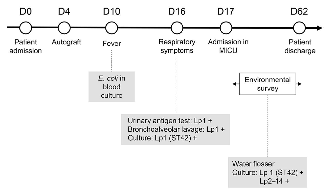 Cronología de la hospitalización del paciente, síntomas y análisis. D, día; Lp1, serogrupo 1 de Legionella pneumophila; Lp2-14, serogrupos de Legionella pneumophila 2-14; MICU, unidad de cuidados intensivos médicos; ST, tipo de secuencia; +, positivo.