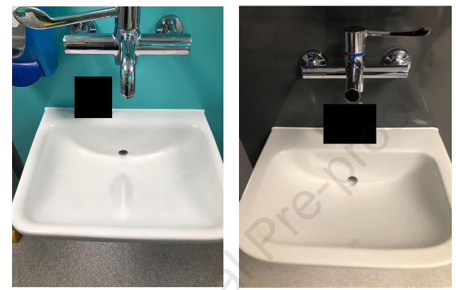 Sólo el 53 % de los fregaderos de áreas del paciente cumplían con las normas nacionales de diseño y el 34 % de los fregaderos mostraron salpicaduras más allá de los límites de la pila, lo que representa un riesgo para los pacientes y las superficies situados alrededor.